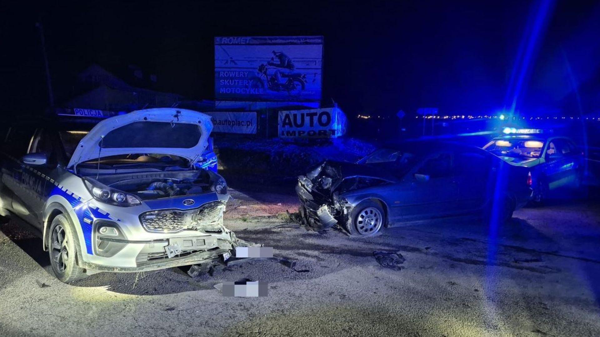 Funkcjonariusze natychmiast poinformowali oficera dyżurnego o sytuacji i ruszyli w pościg. BMW poruszało się z dużą prędkością w kierunku Wierzbnej w powiecie jarosławskim. W trakcie próby skrętu kierujący doprowadził do czołowego zderzenia z jednym z policyjnych radiowozów. Następnie, wykonując manewr cofania, uderzył w drugi radiowóz znajdujący się za nim.