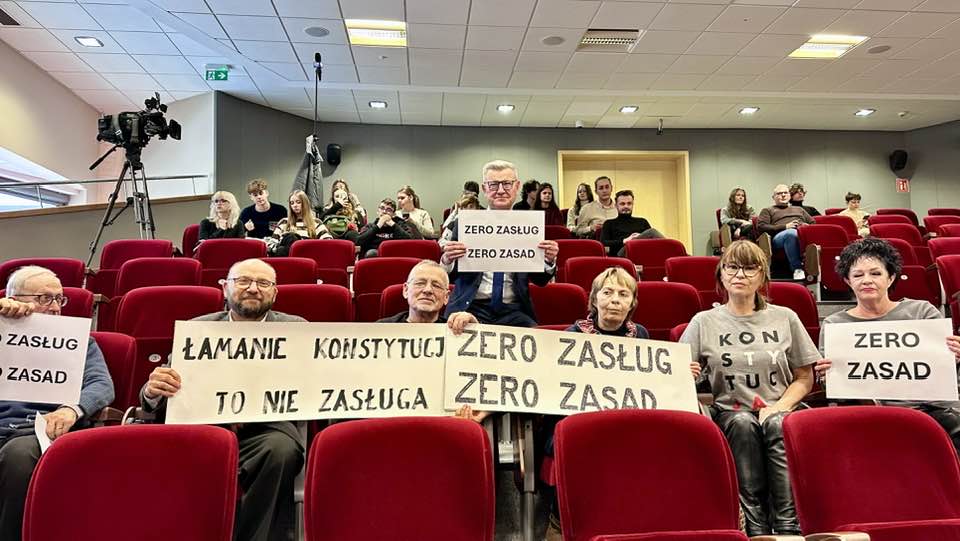 Podczas wystąpienia marszałka radni KO oraz obecni na sali przedstawiciele KOD trzymali plansze z napisami: „Zero zasług, zero zasad” oraz „Łamanie konstytucji to nie zasługa”.
