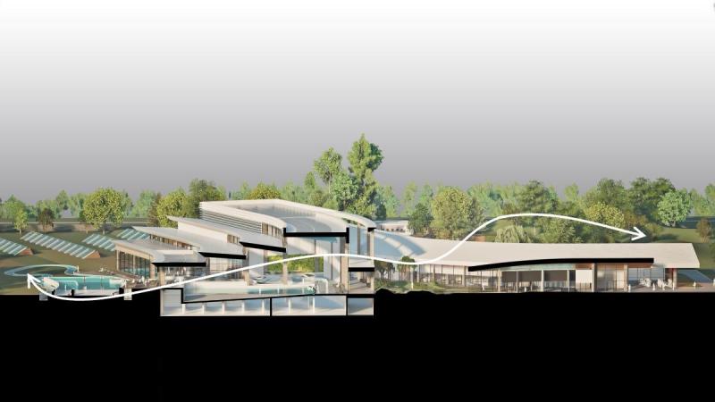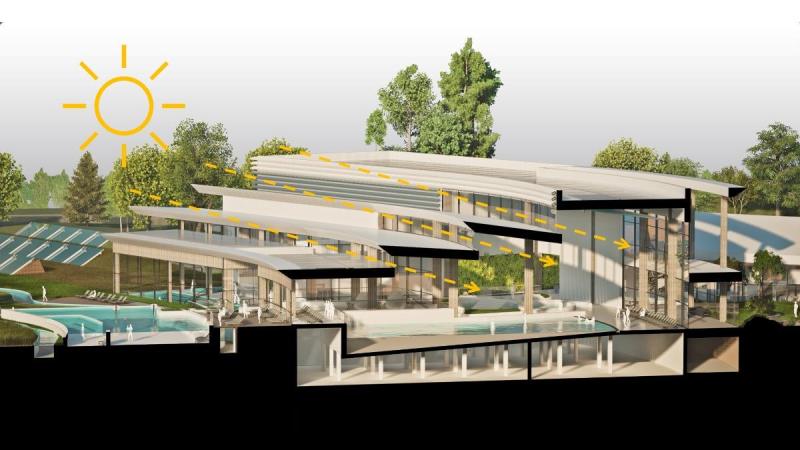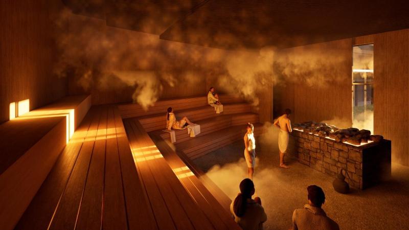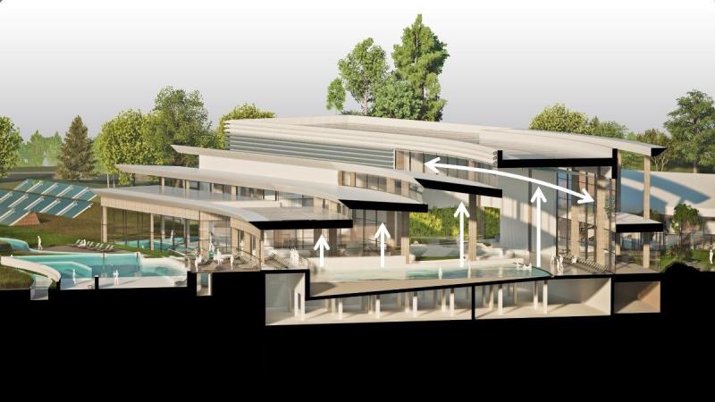 Saunarium będzie oddzielone akustycznie od reszty obiektu. Będzie miało ogrody deszczowe zbierające wodę opadową do podlewania i tworzenia mikroklimatu.