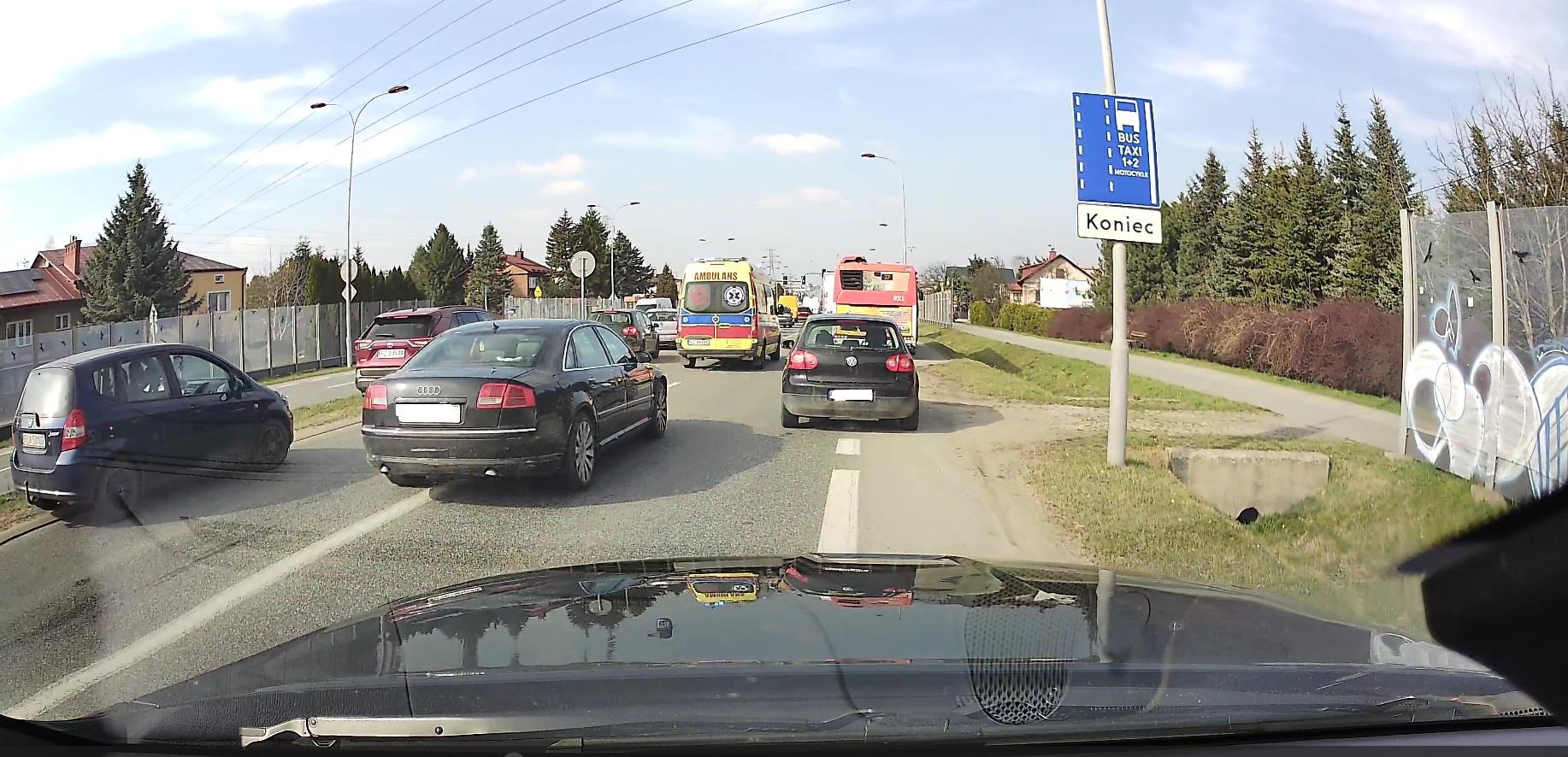 Autor nagrania opisuje, że po chwili na ten sam pas wjechało czarne Audi A8 (numer rejestracyjny znany redakcji) i żeby ominąć korki, jechało w ślad za ambulansem. Według relacji czytelnika, samochodem kierowała kobieta.