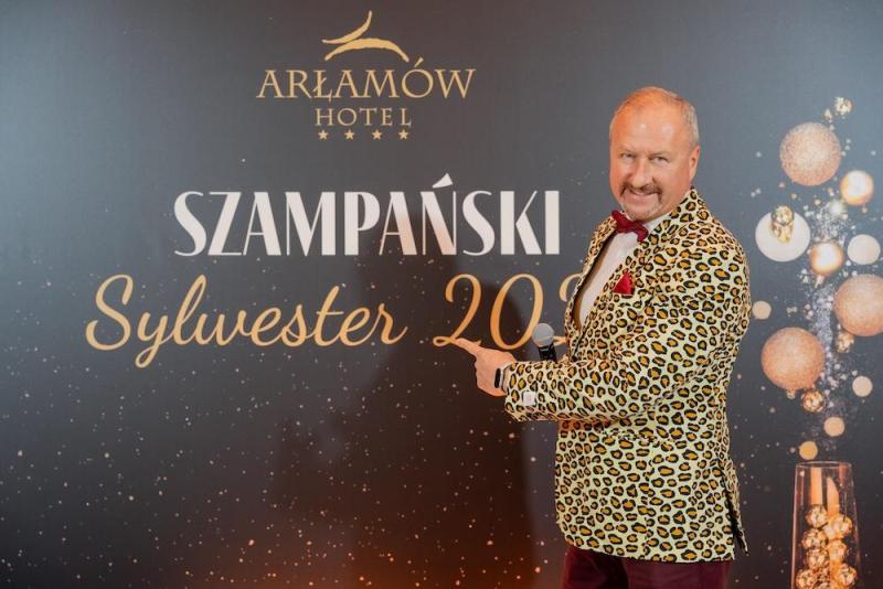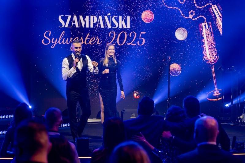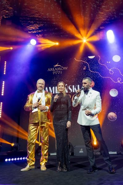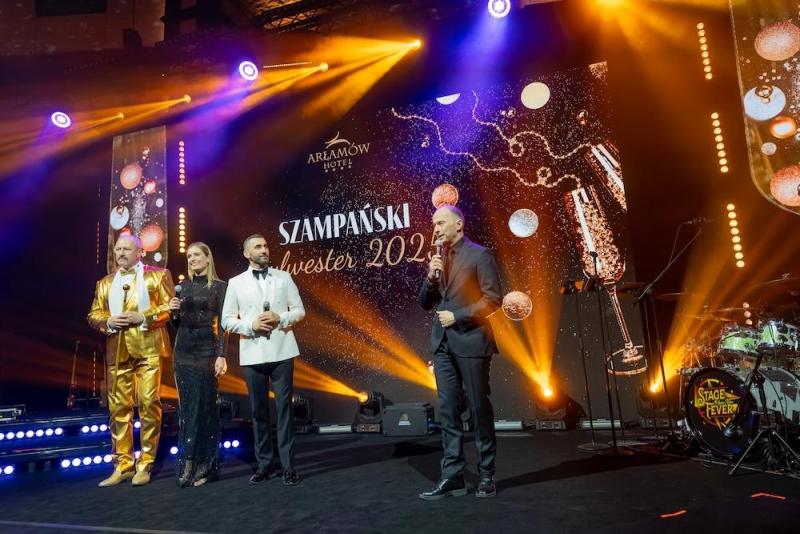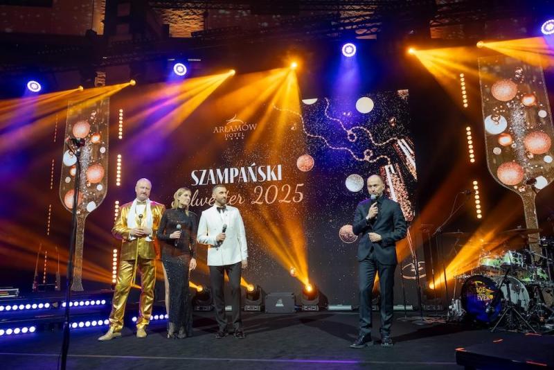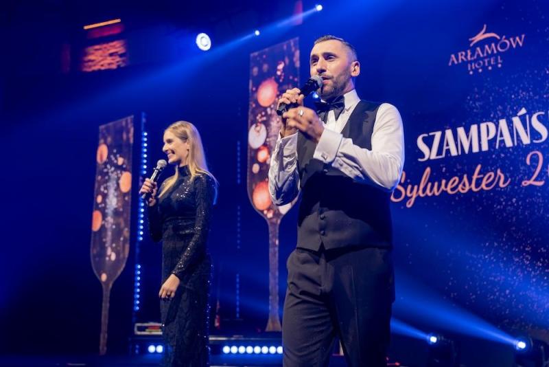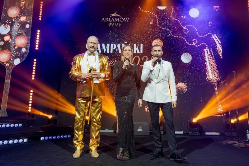 Hotel Arłamów przyzwyczaił gości do wysokiego standardu, ale tegoroczna noc sylwestrowa, jak relacjonują uczestnicy, była prawdziwą “Ligą Mistrzów”. Zamiast tradycyjnych fajerwerków postawiono na spektakularne iluminacje świetlne, a o atmosferę na sali zadbał duet prowadzących: Rafał Maserak i Aleksandra Szutenberg.