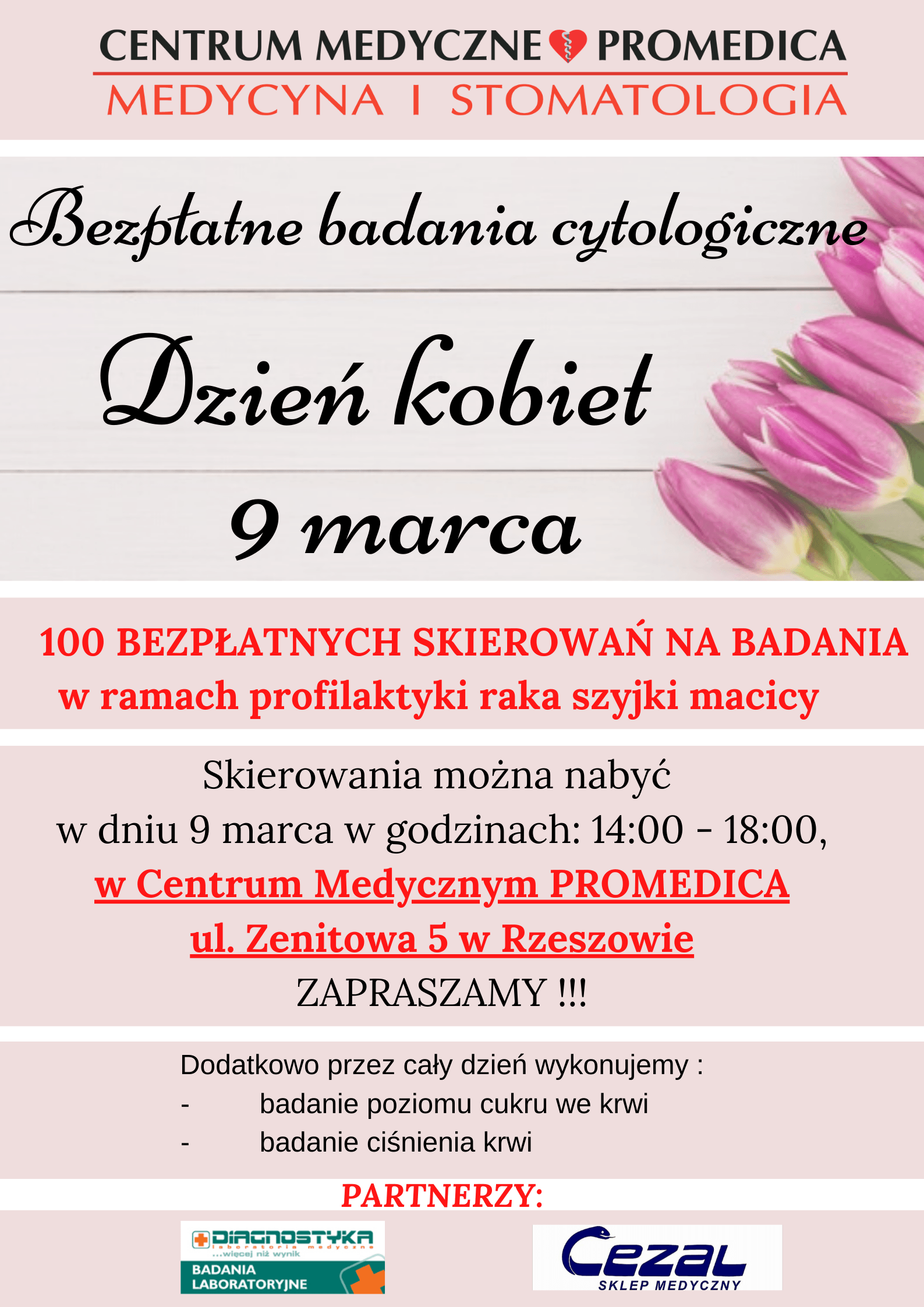 Bezpłatne badania profilaktyczne przeprowadzi Centrum Medycznym Promedica. W poniedziałek, 9 marca, w Promedica (ul. Zenitowa 5, parter, koło Szpitala Wojewódzkiego nr 2 w Rzeszowie) od godz. 14:00 do 18:00 kobiety mogą odbierać bezpłatne skierowania na badania cytologiczne.