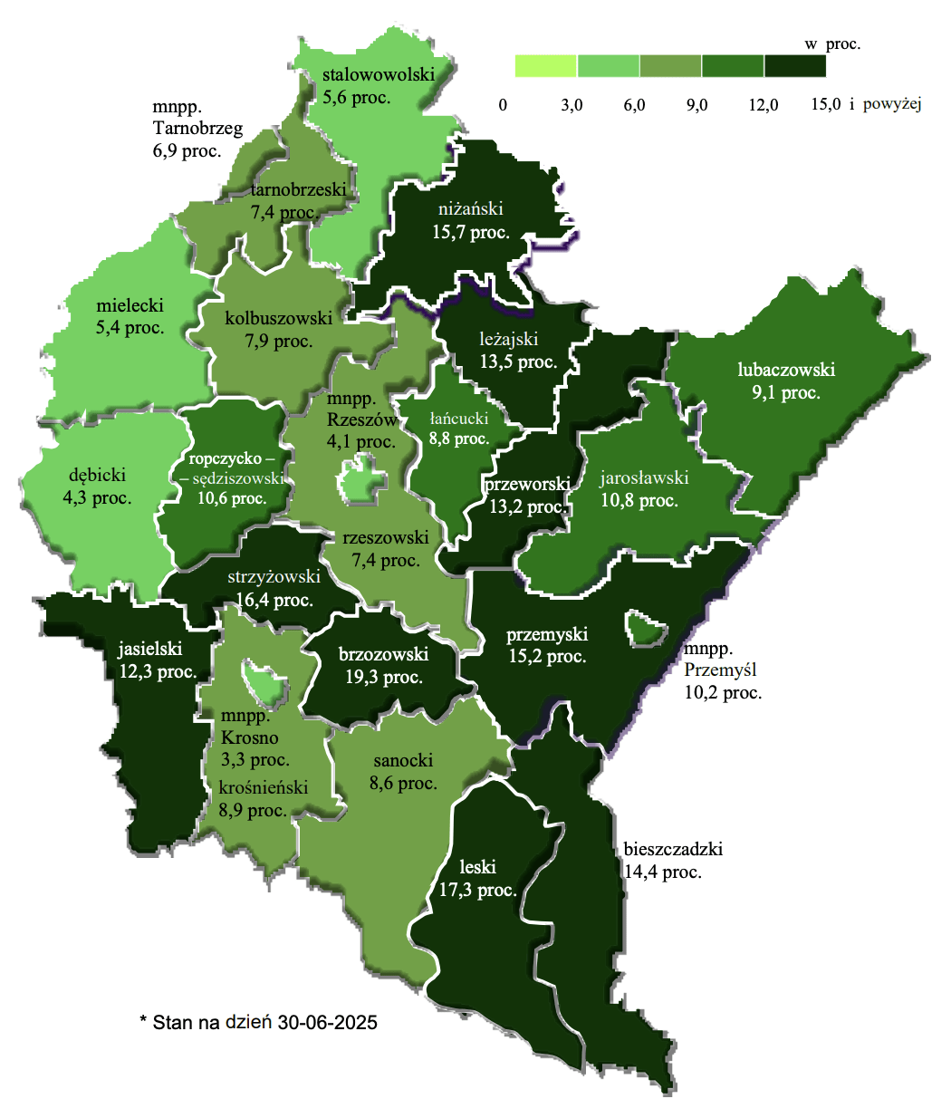 Według danych za czerwiec, województwo podkarpackie, ze stopą bezrobocia na poziomie 8,5 proc., zajęło ostatnie miejsce w rankingu województw. Tuż za nim plasuje się województwo warmińsko-mazurskie (8,1 proc.), a następnie świętokrzyskie (7,5 proc.). Dla porównania, najniższe bezrobocie zanotowano w województwie wielkopolskim (3,1 proc.) i śląskim (3,8 proc.).