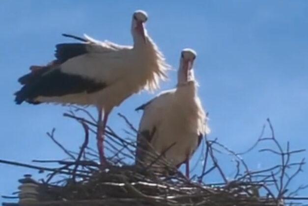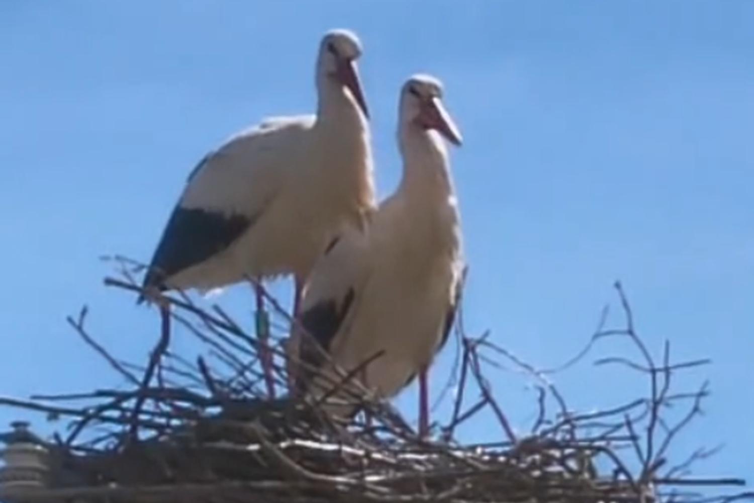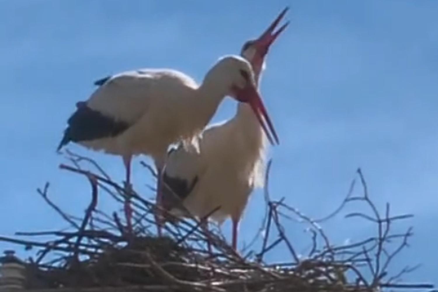 Jeden z bocianów najwyraźniej ma obrączkę na nodze. Oznacza to, że ptak biorze udział w badaniach naukowych. Obrączkowanie pozwala ornitologom śledzić trasy wędrówek, długość życia oraz miejsca zimowania bocianów
