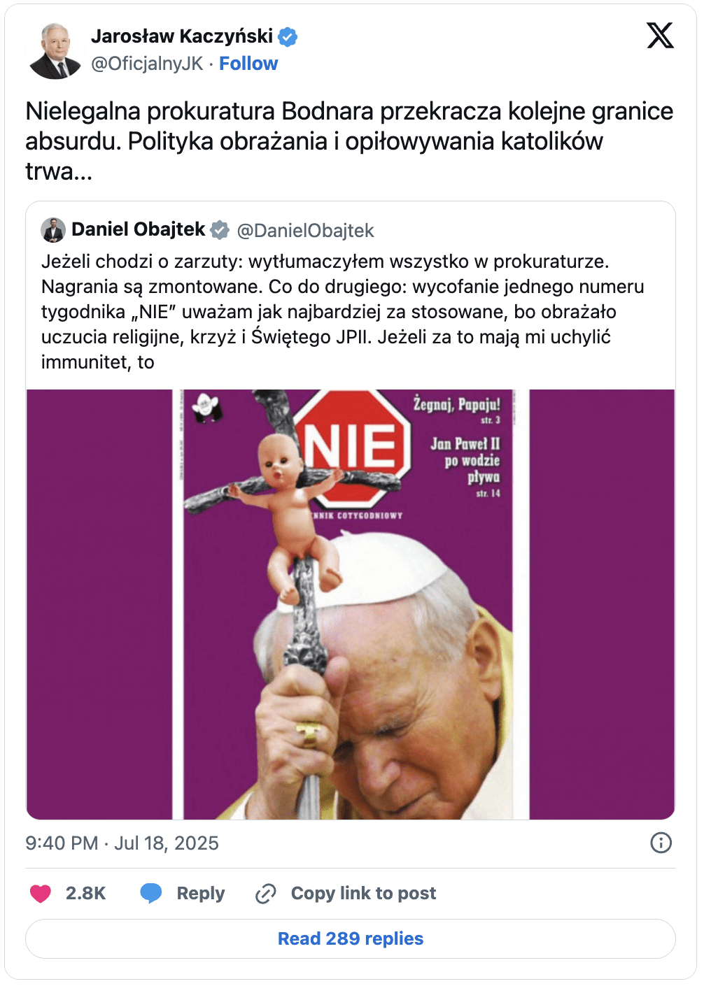 Europosła wziął w obronę sam Jarosław Kaczyński, który na platformie X napisał, że “Nielegalna prokuratura Bodnara przekracza kolejne granice absurdu. Polityka obrażania i opiłowywania katolików trwa…”