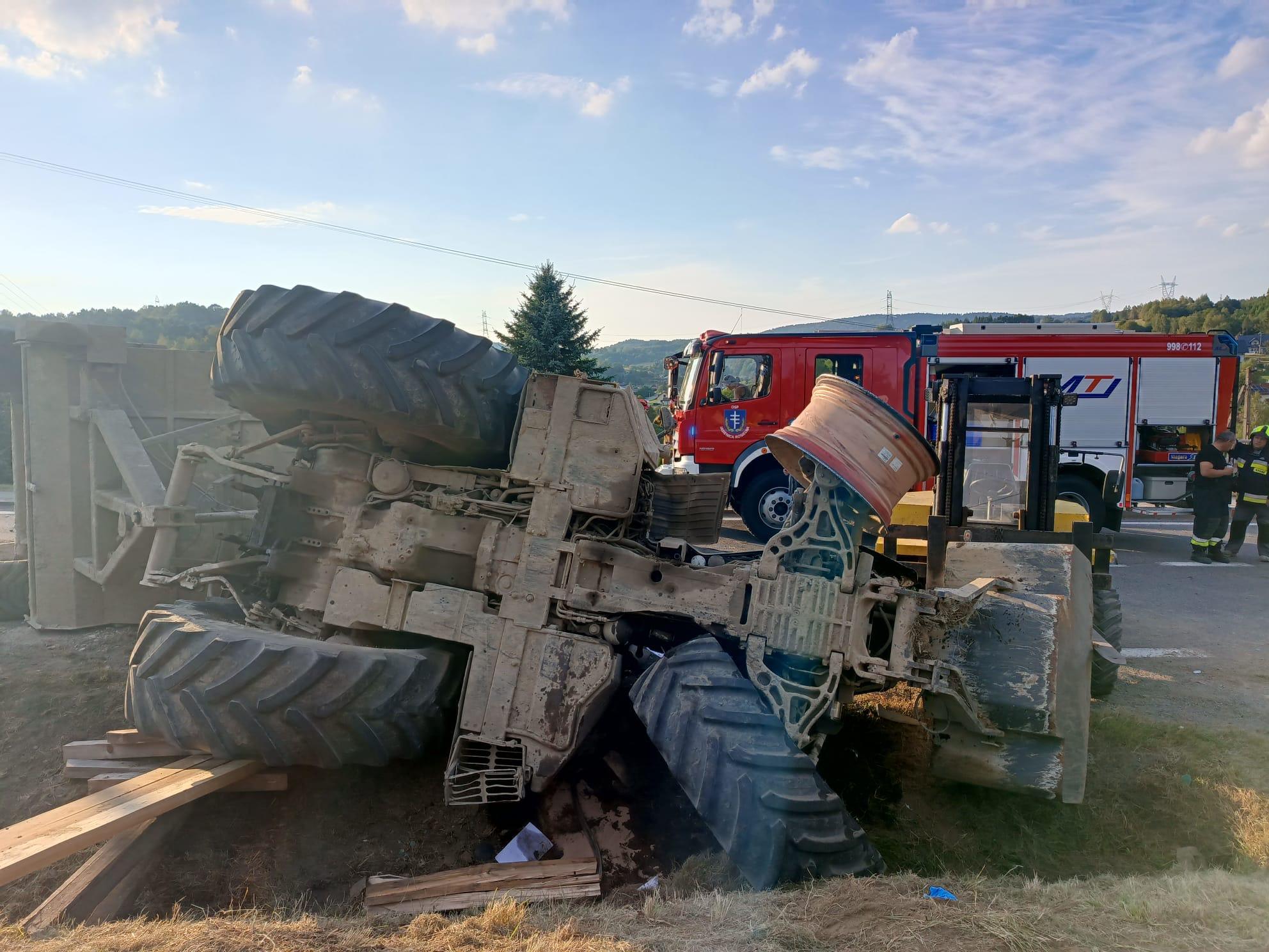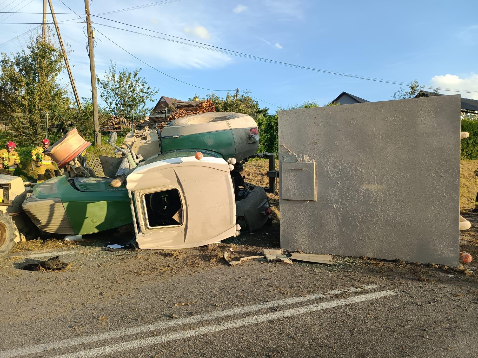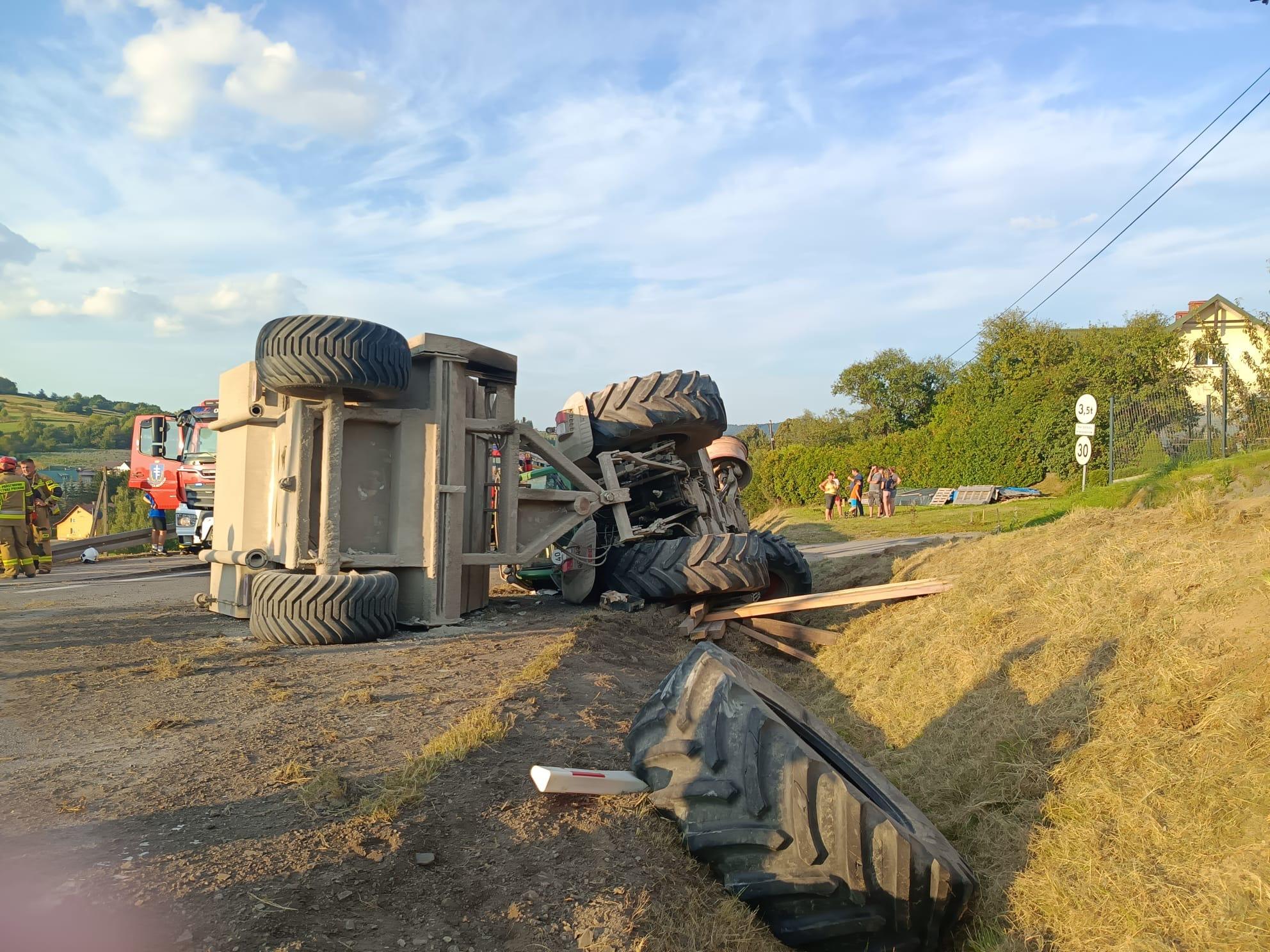 Ciągnik przewrócił się na lewy bok, blokując w całości jeden pas ruchu. Kierowcę udało się wyciągnąć spod przewróconego pojazdu.