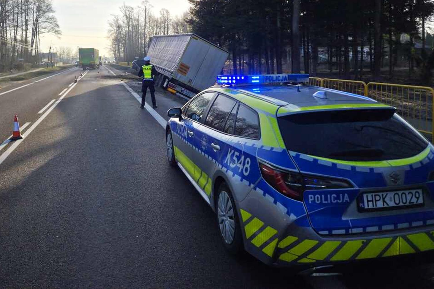 W związku z wypadnięciem ciężarówki z jezdni ruch na tym fragmencie drogi odbywa się obecnie wahadłowo. Policjanci kierują ruchem, aby zapewnić przejazd pojazdom w obu kierunkach.