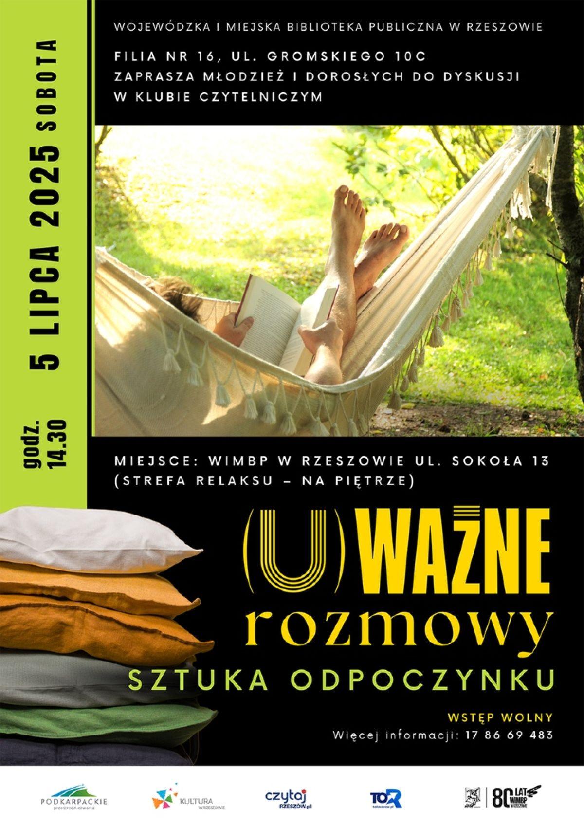 Skoro wakacje, to oczywiście odpoczynek. I to właśnie ta niedoceniana umiejętność będzie tematem sobotniej dyskusji w klubie czytelniczym „(U)ważne rozmowy” w Wojewódzkiej i Miejskiej Bibliotece Publicznej w Rzeszowie (przy ul. Sokoła 13). Wydarzenie rozpocznie się o godz. 14:30 i jest adresowane do młodzieży i dorosłych. W trakcie inspirujących rozmów uczestnicy zastanowią się czy potrafią odpoczywać, co zyskują dzięki odpoczynkowi oraz do jakich skutków doprowadza jego brak lub niewystarczająca ilość. Rozmowom będzie towarzyszyć książka „Mój rok relaksu i odpoczynku” Ottessy Moshfegh. Wstęp wolny.