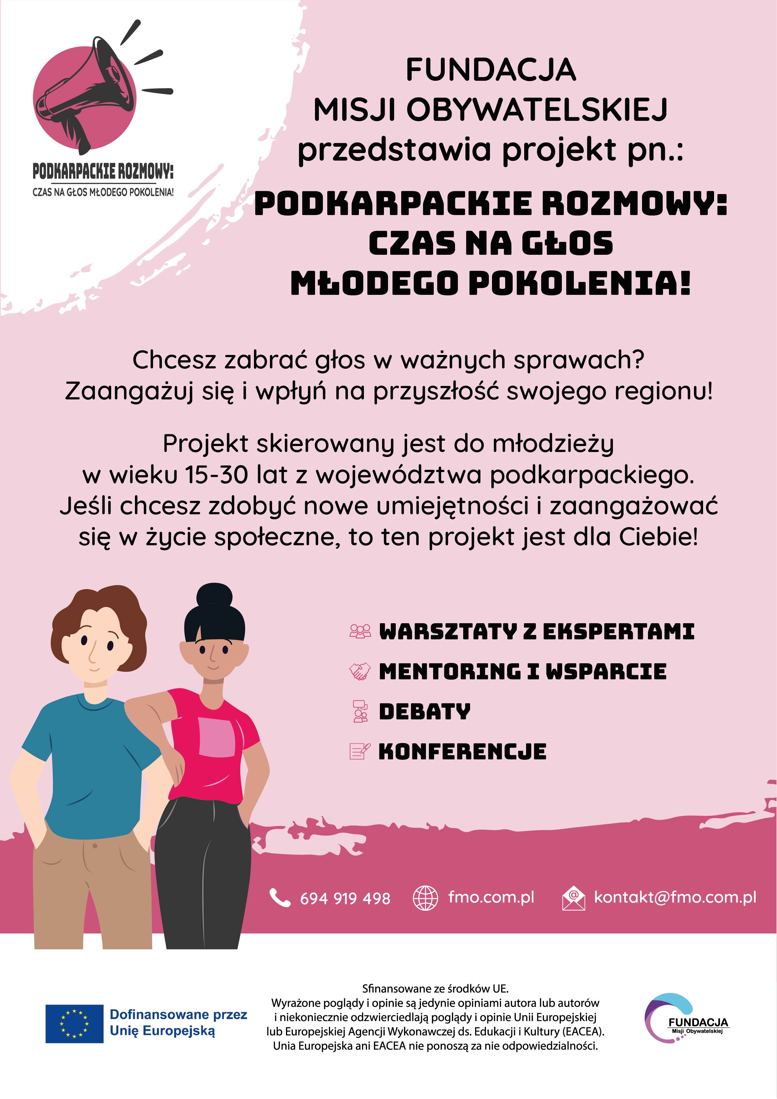 Fundacja Misji Obywatelskiej ogłasza start nowego, innowacyjnego projektu „Podkarpackie Rozmowy: Czas na Głos Młodego Pokolenia!”. Jego celem jest aktywizacja młodzieży z województwa podkarpackiego i zwiększenie jej zaangażowania w życie społeczne i obywatelskie.