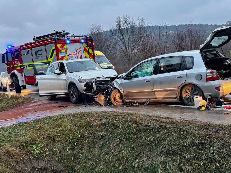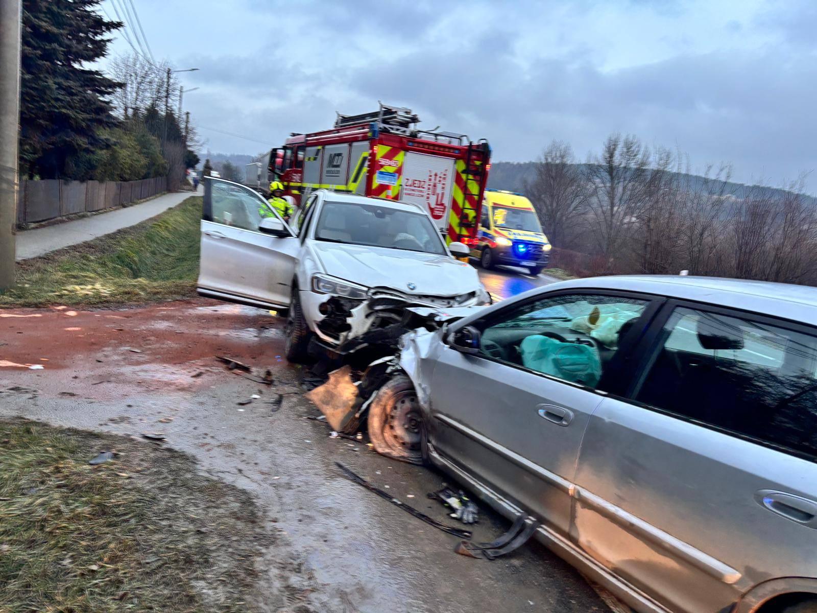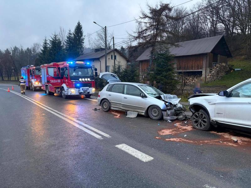 Czołowe zderzenie zaliczyły biały SUV-a marki BMW i srebrny hatchback, które zablokowały jeden z pasów ruchu. Oba pojazdy zostały poważnie uszkodzone, co świadczy o dużej sile uderzenia. Na jezdni widoczne są rozlane płyny eksploatacyjne, które strażacy zasypali substancją sorbującą.