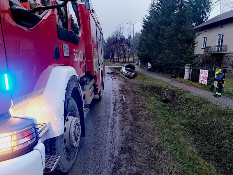Osobny dramat rozegrał się kilka metrów dalej. Jedno ze zdjęć przedstawia trzeci samochód biorący udział w zdarzeniu – srebrne auto osobowe, które “zanurkowało” przodem w głębokim rowie melioracyjnym tuż przy chodniku i posesjach mieszkalnych.