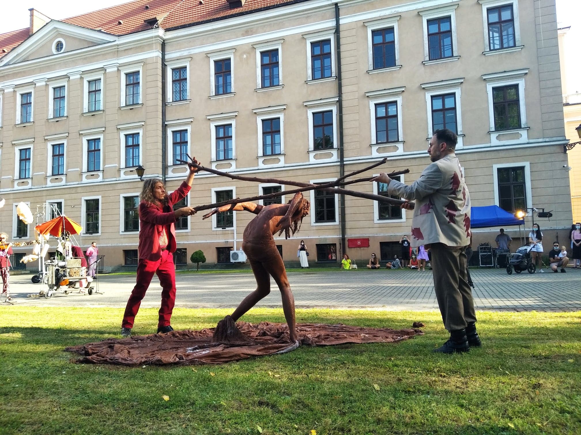 Aktorom, którzy przeprowadzili widzów przez cały dziedziniec, towarzyszyła nastrojowa muzyka, wykonywana na żywo. Podczas spektaklu nie zabrakło też konstrukcji, które aktorzy wprawiali w ruch. Niezmiennie robiły one wrażenie.