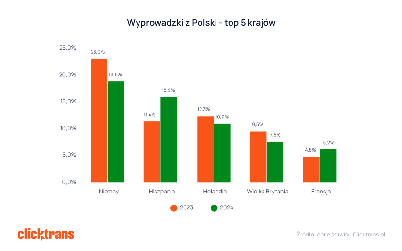 Krajem, do którego najchętniej wyprowadzali się Polacy w 2024 roku, były Niemcy. Ich udział w zleceniach przeprowadzkowych spadł jednak w stosunku do 2023 roku o 4,2 punkty procentowe i wyniósł 18,8 proc.