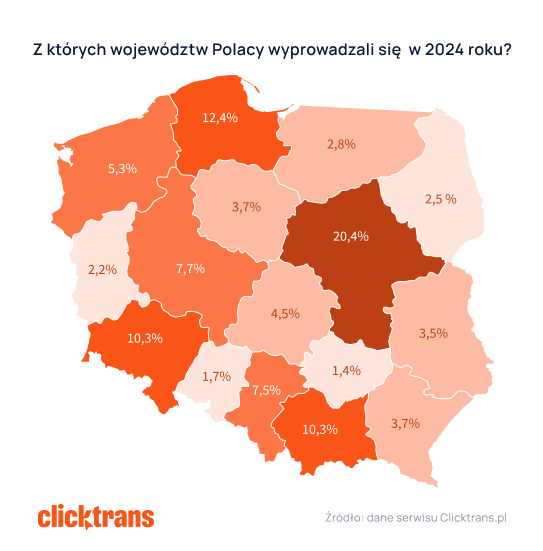 Zdecydowanie najczęściej wybieranym miejscem było województwo mazowieckie, do którego przeprowadziło się aż 21,3 proc. zgłaszających a “odpłynęło” z niego 20,4 proc.