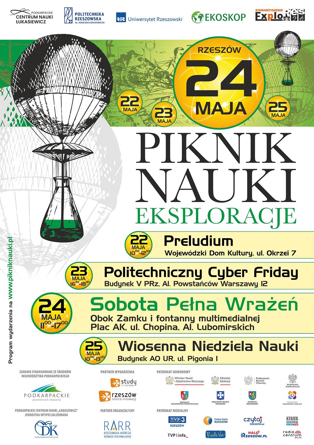Organizatorzy: Podkarpackie Centrum Nauki „Łukasiewicz”, Politechnika Rzeszowska, Uniwersytet Rzeszowski, ExploRes i Ekoskop – zapraszają do świata nauki i techniki. W programie pokazy, eksperymenty i prezentacje, które przybliżą uczestnikom różnorodne dziedziny wiedzy w ciekawy i angażujący sposób.