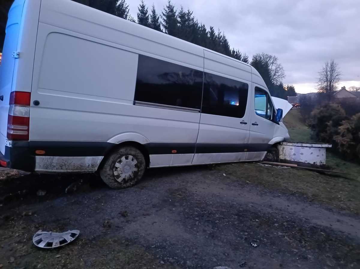Dziewięciu pasażerów podróżujących busem marki Mercedes może mówić o wielkim szczęściu. Pojazd, którym jechali, wypadł z drogi krajowej nr 28, uderzył w betonowy przepust, a następnie z impetem wbił się w przydomową studnię.
