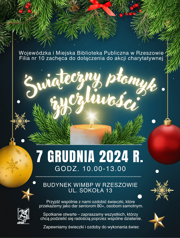 Wojewódzka i Miejska Biblioteka Publiczna w Rzeszowie – Filia nr 10 zachęca do dołączenia do akcji charytatywnej „Świąteczny płomyk życzliwości”. W jej trakcie będzie można podzielić się radością z seniorami.