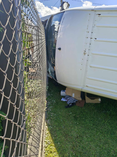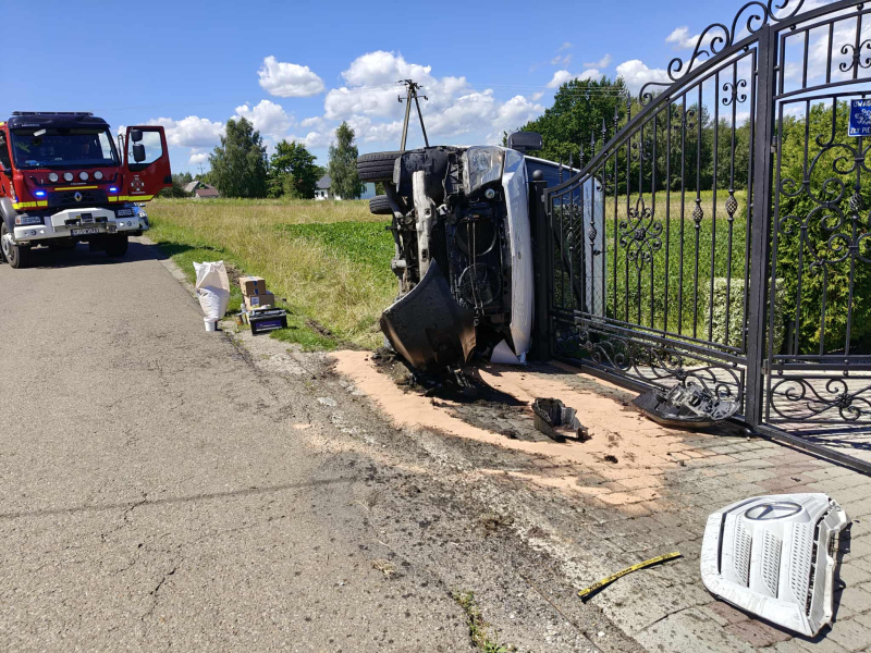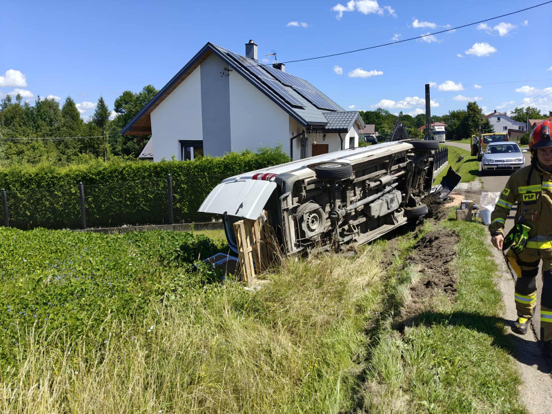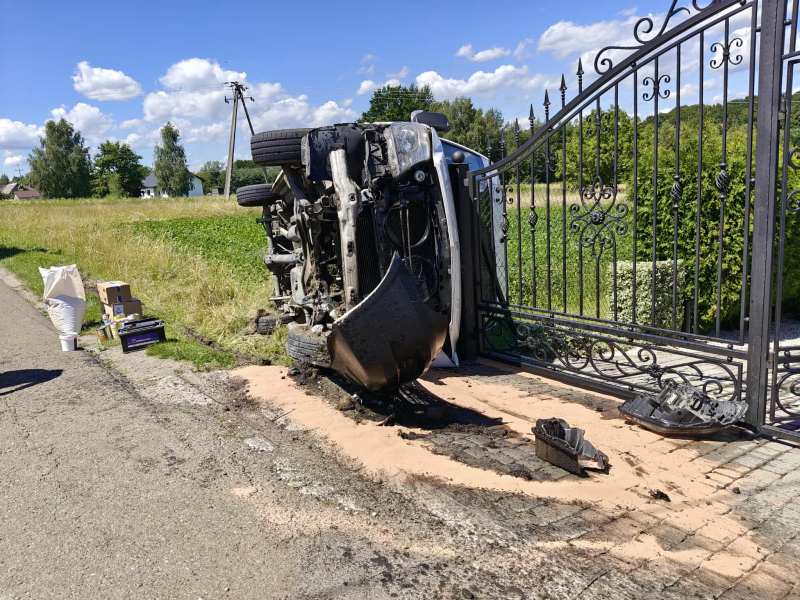 We wtorek 23 lipca, w godzinach południowych, doszło do groźnie wyglądającego zdarzenia drogowego w miejscowości. Dostawczy bus zjechał z jezdni, przewrócił się na bok i uderzył w ogrodzenie prywatnej posesji.