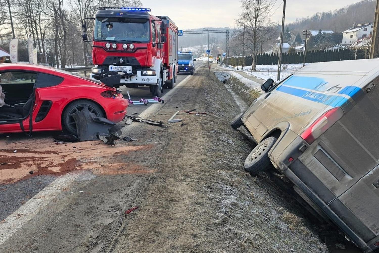 W tym samym momencie nadjeżdżał prawidłowo poruszający się samochód ciężarowy marki Volvo z naczepą. – W wyniku tego zdarzenia porsche uderzyło w prawidłowo jadący pojazd ciężarowy – dodał rzecznik strzyżowskiej policji.