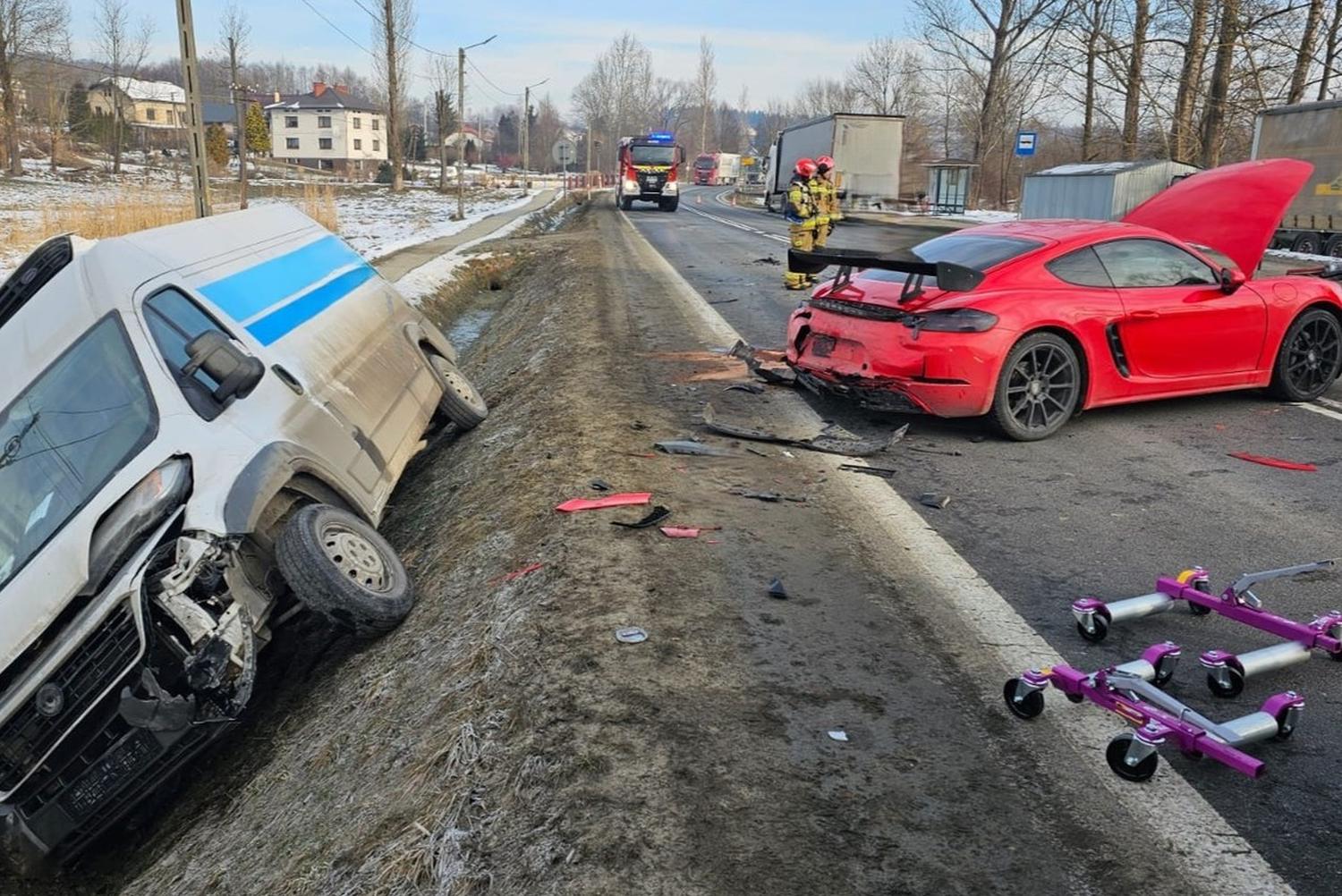 W zderzeniu brały udział trzy pojazdy: bus, samochód osobowy marki Porsche oraz samochód ciężarowy z naczepą.