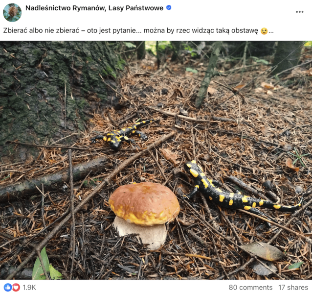 Wszystko zaczęło się od jednego, fenomenalnego kadru autorstwa Michała Brzeskiego. Na leśnej ściółce, w pełnej krasie, pręży się dorodny borowik. Tuż obok niego, jak dwóch wiernych ochroniarzy, leżą dwie salamandry plamiste, których jaskrawe ubarwienie idealnie komponuje się z leśnym otoczeniem. Leśnicy z Nadleśnictwa Rymanów, publikując zdjęcie, z humorem sparafrazowali Szekspira: „Zbierać albo nie zbierać – oto jest pytanie… można by rzec widząc taką obstawę”.