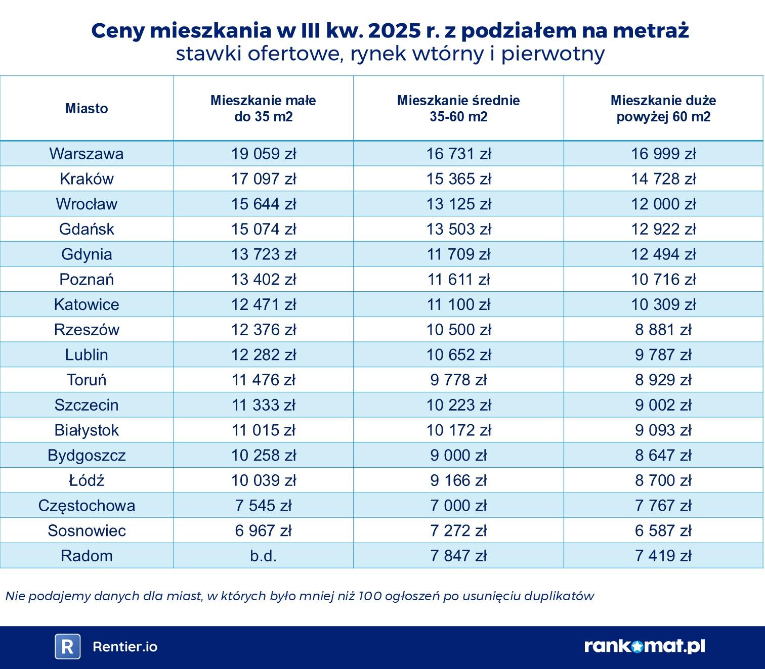 W Częstochowie na zakup mieszkania o powierzchni 50 m² w III kw. 2025 r. wystarczyło 35 tys. zł wkładu własnego. W Rzeszowie jest to już 52 500 zł, a w Warszawie i Krakowie – kolejno 83 654 zł i 76 827 zł.