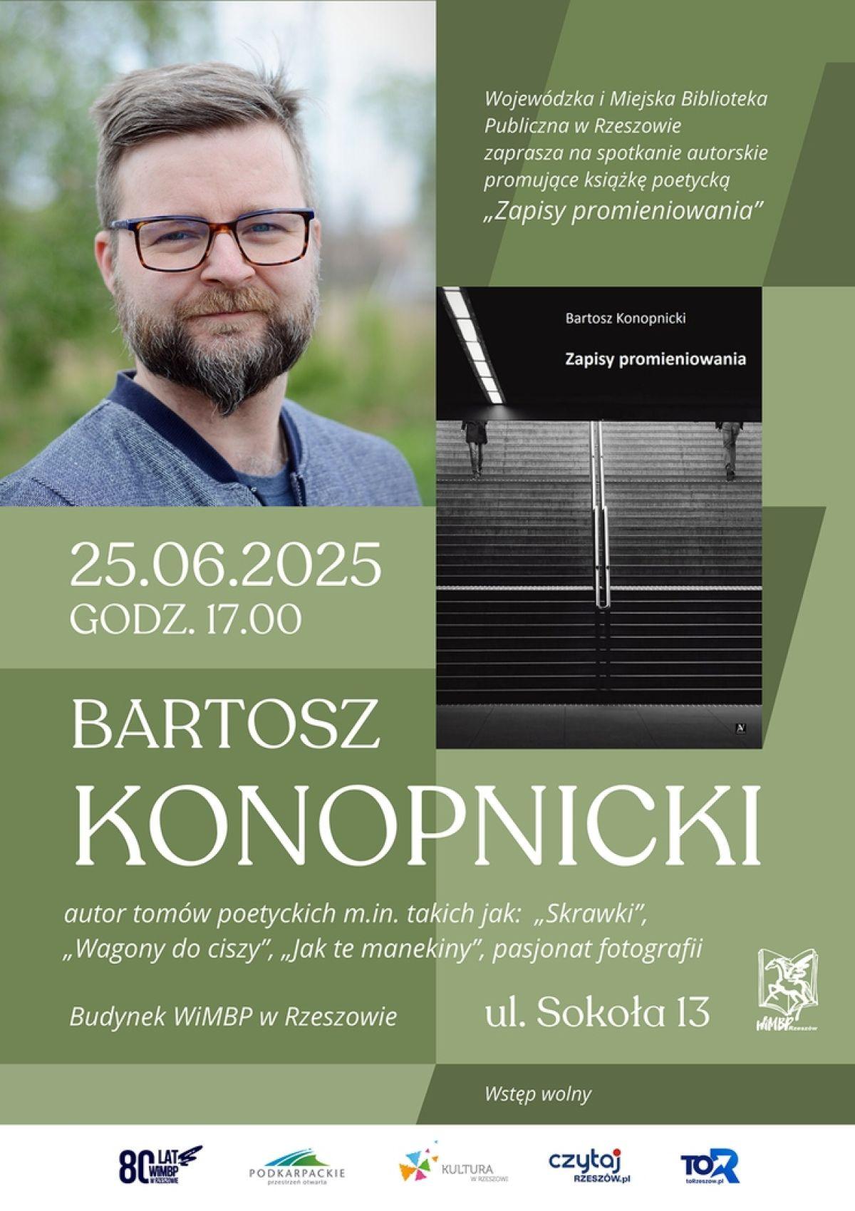 W środę o godz. 17:00 w Wojewódzkiej i Miejskiej Bibliotece Publicznej w Rzeszowie (przy ul. Sokoła 13) odbędzie się spotkanie autorskie z Bartoszem Konopnickim. Autor będzie promował swoją nową książkę poetycką „Zapisy promieniowania”. Z pewnością będzie to ciekawe wydarzenie dla miłośników poezji. Wstęp wolny.