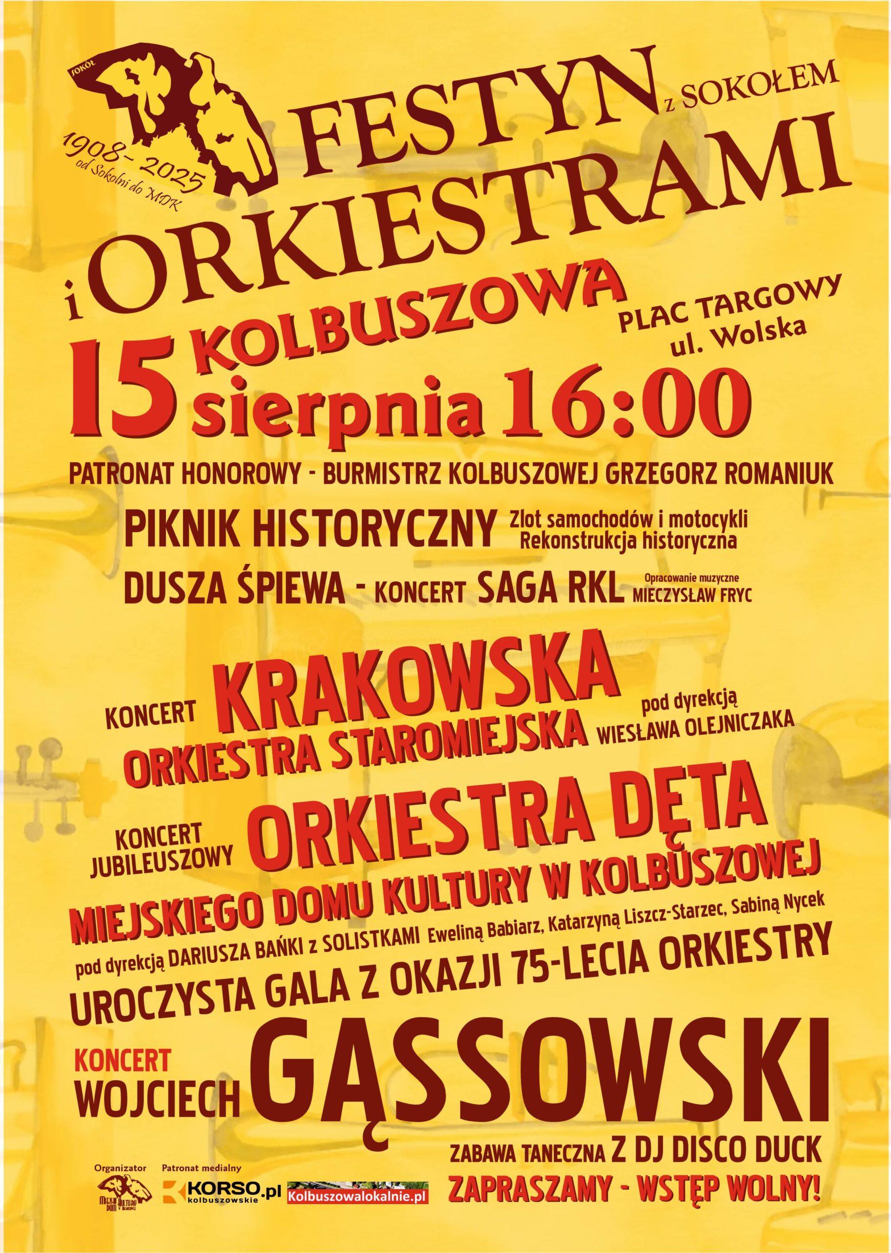 W trakcie rozpoczynającego się weekendu bardzo dużo będzie się działo w Kolbuszowej. W ramach „Wielkiego Weekendu” odbędzie się kilka dużych wydarzeń pełnych atrakcji, koncertów i wspólnej zabawy. Już w piątek (15 sierpnia) na Placu Targowym przy ul. Wolskiej o godz. 16:00 rozpocznie się Festyn z Sokołem i Orkiestrami. Odbędzie się tam piknik historyczny wraz z rekonstrukcją historyczną i zlotem samochodów i motocykli. Nie zabraknie także występów artystycznych – zagrają m.in.: Krakowska Orkiestra Staromiejska, Orkiestra Dęta MDK w Kolbuszowej oraz gwiazda wieczoru – Wojciech Gąssowski.