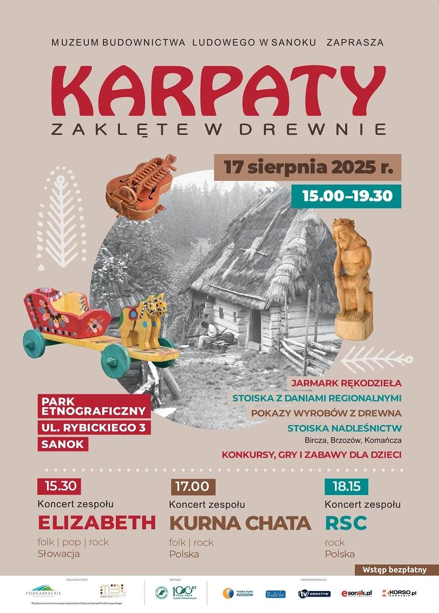 Wyjątkowych wrażeń nie zabraknie także w niedzielę w Muzeum Budownictwa Ludowego w Sanoku, gdzie w godzinach 15:00-19:30 odbędzie się wydarzenie „Karpaty zaklęte w drewnie”. Wydarzenie łączy w sobie muzykę, taniec oraz bogatą tradycję folkloru krajów karpackich z jarmarkiem rękodzieła ludowego i artystycznego. Na miejscu znajdziecie także stoiska z daniami regionalnymi, pokazy wyrobów z drewna, stoiska nadleśnictw, a także konkursy, gry i zabawy dla dzieci. Będą również koncerty zespołów: Elizabeth (15:30), Kurna Chata (17:00) i RSC (18:15).
