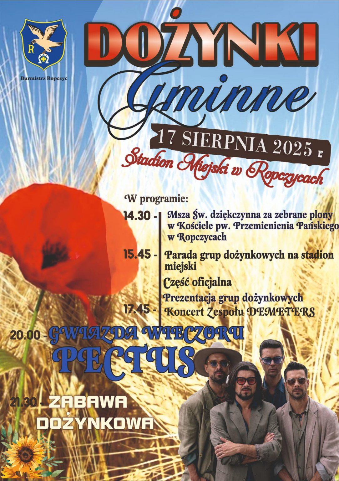 W niedzielę świętowanie odbędzie się w także na Stadionie Miejskim w Ropczycach, a to w ramach obchodów Dożynek Gminnych. Po mszy świętej (od 14:30) odbędzie się parada i prezentacja grup dożynkowych. O godz. 17:45 wystąpi zespół Demeters, a o 20:00 gwiazda wieczoru – zespół Pectus. Na 21:30 zaplanowana jest wieńcząca imprezę zabawa dożynkowa.