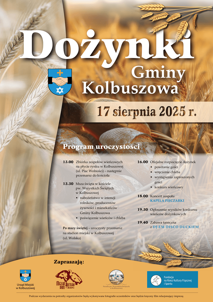 W niedzielę (17 sierpnia) w Kolbuszowej odbędą się Dożynki Gminne, czyli wielkie święto obchodzone po zakończeniu żniw i będące podziękowaniem za zebrane plony i pracę rolników. Uroczystości rozpoczną się już o godz. 13:00 na płycie Rynku, skąd zespoły z pięknymi wieńcami przemaszerują na mszę świętą. Następnie na stadionie miejskim odbędą się oficjalne uroczystości, a o godz. 18:00 wystąpi Kapela Pieczarki. Całość zakończy ogłoszenie wyników konkursu wieńców dożynkowych oraz zabawa taneczna z DJ-em Disco Duckiem.