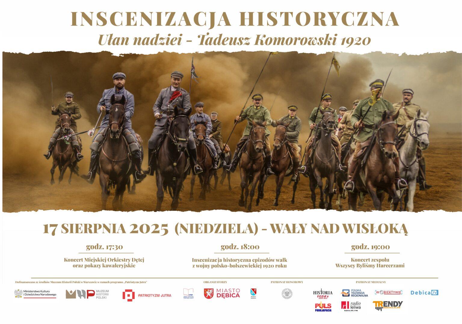 Bardzo ciekawie zapowiada się patriotyczna niedziela w Dębicy. Będą tam szarże kawaleryjskie, popisy konne, żołnierze polskiej piechoty, efekty pirotechniczne oraz koncerty Miejskiej Orkiestry Dętej (od godz. 17:30) i zespołu Wszyscy Byliśmy Harcerzami (od godz. 19:00). Wydarzenie na wałach nad Wisłoką jest organizowane w ramach obchodów Święta Wojska Polskiego oraz Roku Generała Tadeusza Bora-Komorowskiego. Główne wydarzenie wieczoru, czyli wielka inscenizacja historyczna pod hasłem „Ułan nadziei – Tadeusz Komorowski 1920”, rozpocznie się o godz. 18:00. Będzie to obraz epizodów walk z wojny polsko-bolszewickiej 1920 roku.