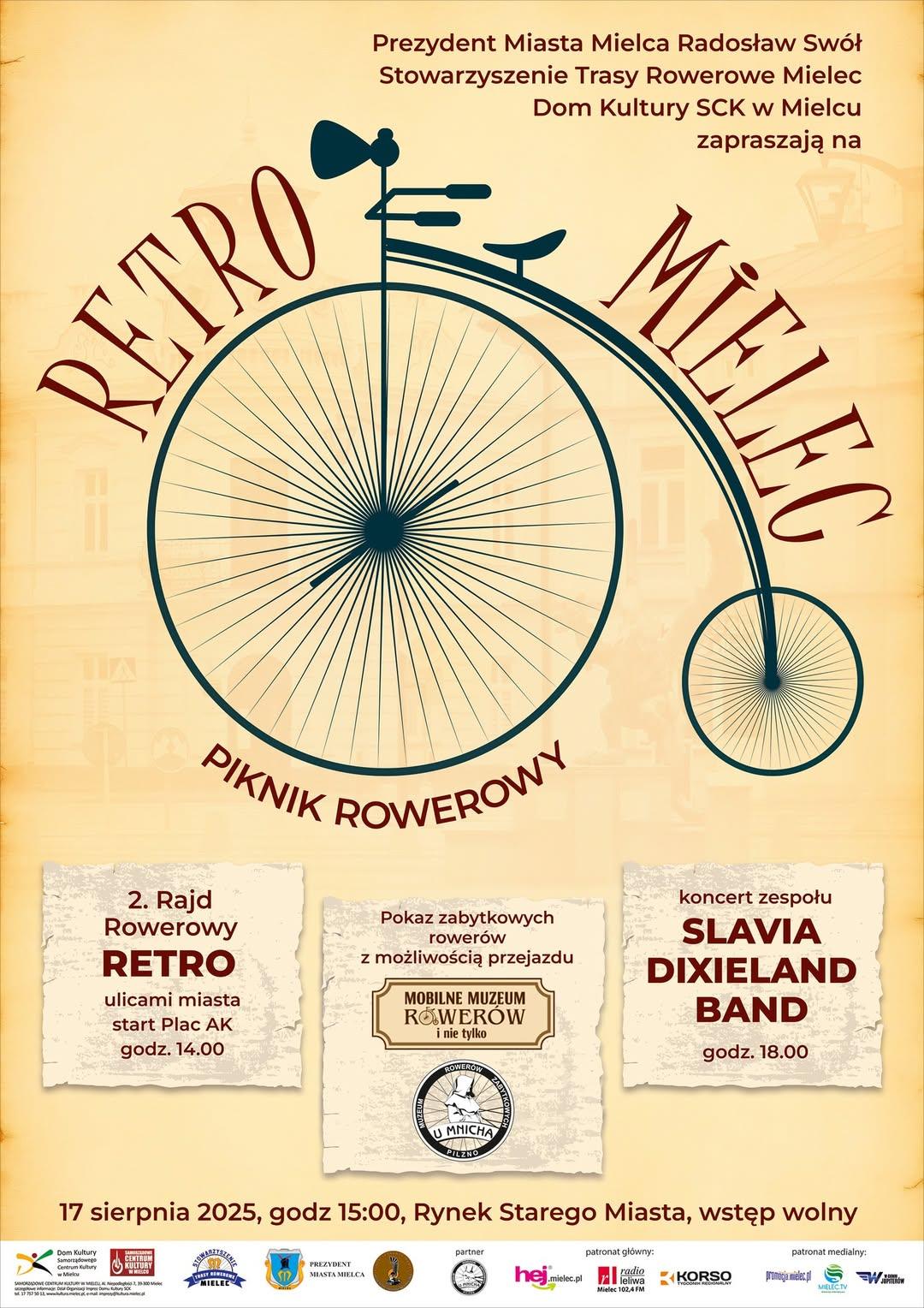 W niedzielę (17 sierpnia) historycznie za sprawą pikniku rowerowego „Retro Mielec”, będzie także na mieleckim Rynku. Jak podkreśla tamtejszy ratusz, miasto wróci do dawnych lat, a na osiedlach i ulicach pojawią się rowerzyści w zabytkowych strojach. Mielczanie na Rynku będą mogli obejrzeć przedwojenne rowery, a nawet się nimi przejechać. Swoje zbiory zaprezentują: Mobilne Muzeum Rowerów z Radomia oraz Muzeum Zabytkowych Rowerów „u Mnicha” z Pilzna. Na godz. 18:00 zaplanowany jest też koncert zespołu Slavia Dixieland Band z Krosna.