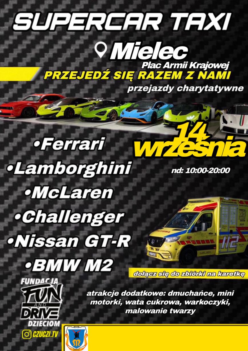 Sporo emocji będzie na Was czekać także w Mielcu. W niedzielę odbędzie się tam impreza Supertaxi Car. Na Placu Armii Krajowej będzie można nie tylko podziwiać, ale także przejechać się najbardziej kultowymi sportowymi autami. Na uczestników czekają m.in.: Lamborghini Huracan EVO Spyder 900 KM, Lamborghini Huracan STO, McLaren 600LT, Ferrari 488 GTB Novitec powered, Nissan GT-R R35, Mercedes AMG GT-R, Dodge Challenger Hellcat oraz BMW M2. Każdy, kto zdecyduje się wesprzeć szczytną akcję zbiórki na karetkę, będzie miał okazję usiąść za kierownicą, poczuć prawdziwą moc setek koni mechanicznych, a także zrobić pamiątkowe zdjęcia. Trasy zostały przygotowane tak, by dostarczyć maksimum adrenaliny i niezapomnianych emocji. Na miejscu będą także atrakcje dla dzieci, w tym: dmuchańce, motorki, wata cukrowa, malowanie twarzy, kolorowe warkoczyki i inne niespodzianki.