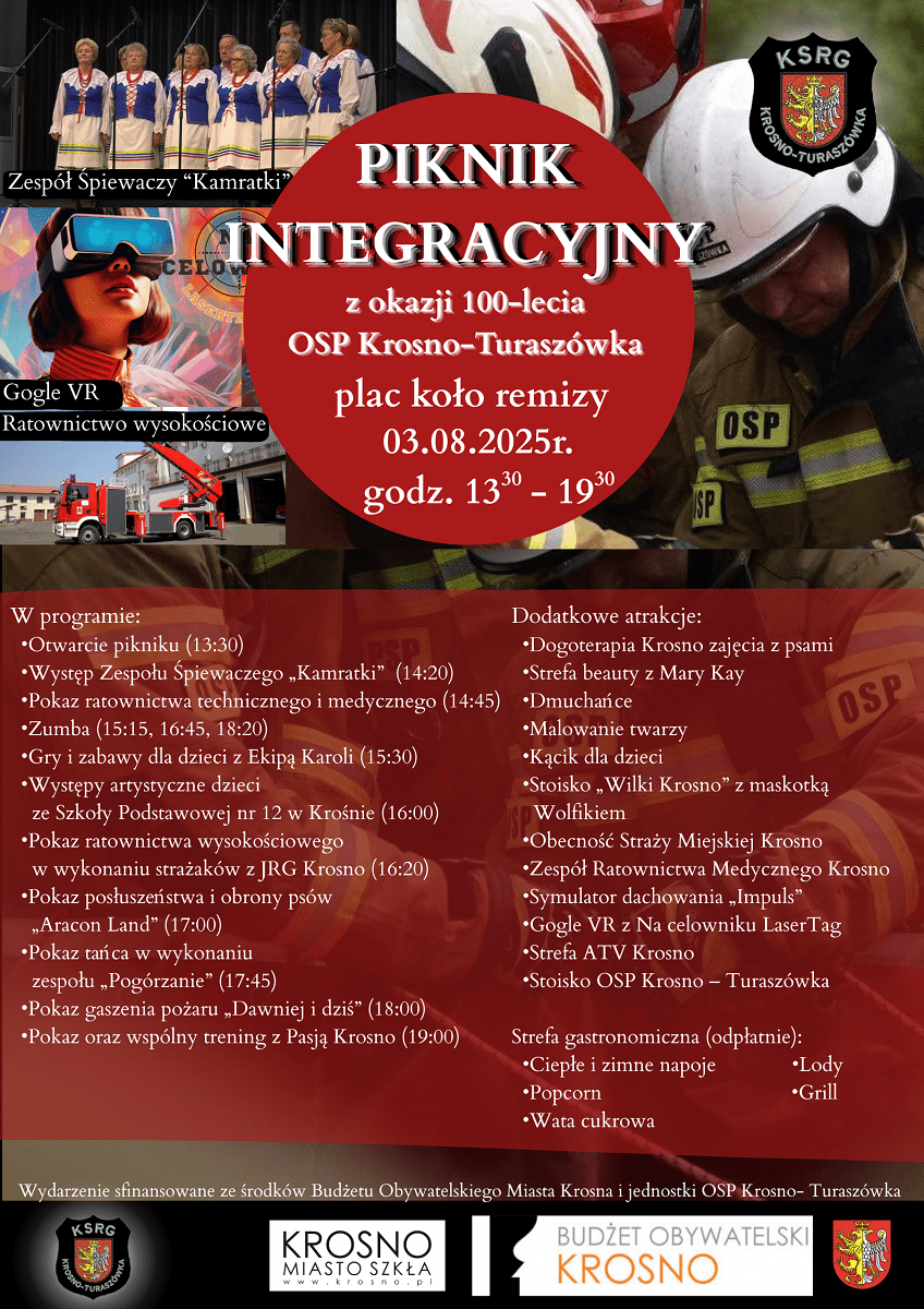 Ciekawie będzie także w Krośnie, gdzie w niedzielę (3 sierpnia) w godzinach 13:30 – 19:30 odbędzie się Piknik Integracyjny z okazji 100-lecia OSP Krosno-Turaszówka. W programie będzie pokaz ratownictwa technicznego i medycznego, pokaz ratownictwa wysokościowego oraz gaszenia pożarów. Na miejscu czekać będą zajęcia zumby, gry i zabawy, dogoterapia z udziałem psów, wspólne treningi sportowe oraz atrakcje dla dzieci i starszych. Nie zabraknie oczywiście także strefy gastronomicznej oraz występów artystycznych.