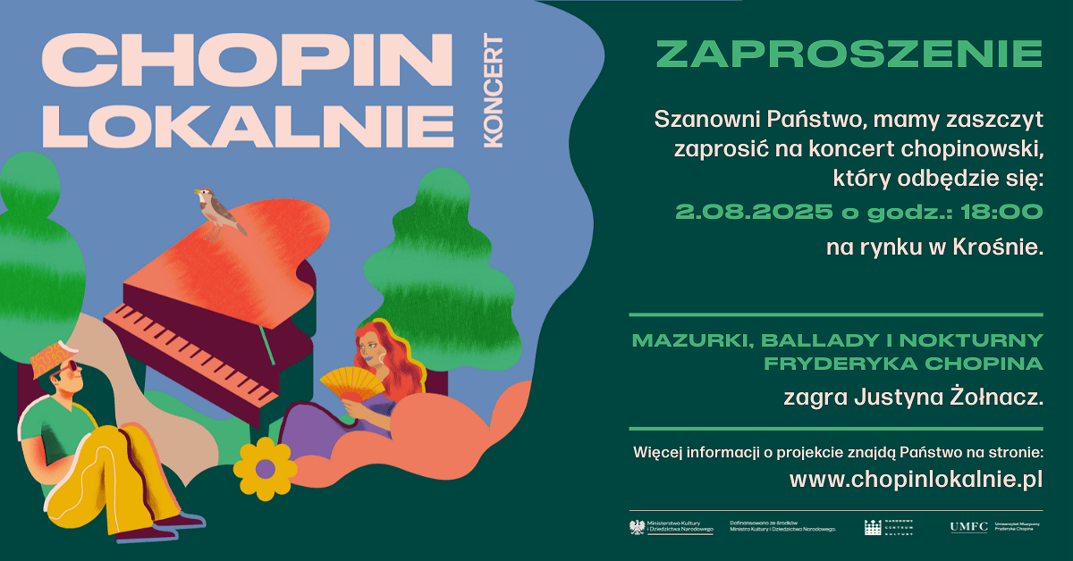 Dla miłośników muzyki klasycznej ciekawą propozycją będzie wyjątkowy koncert „Chopin lokalnie”, który rozpocznie się w sobotę (2 sierpnia) o godz. 18:00 na Rynku w Krośnie. Celem projektu jest organizacja recitali fortepianowych w miejscach o ograniczonym dostępie do wydarzeń artystycznych. Ich realizacja ma sprzyjać wspólnemu uczestnictwu w kulturze i integracji mieszkańców. Muzyki, ballady i nokturny Fryderyka Chopina zagra Justyna Żołnacz.