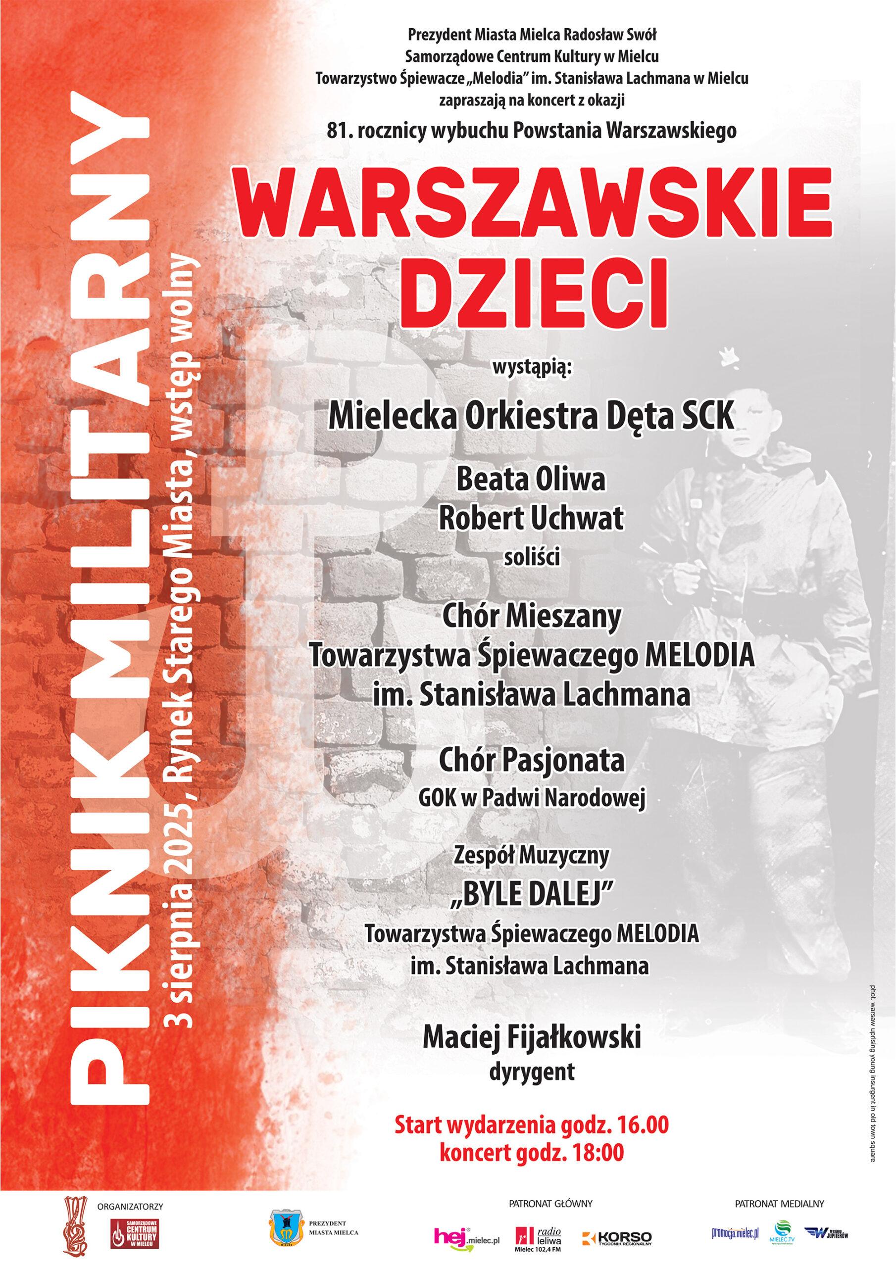 W niedzielę (3 sierpnia) będzie można zawitać także do Mielca, gdzie odbędzie się Piknik Militarny połączony z koncertem pieśni patriotycznych „Warszawskie Dzieci”. Wydarzenie to będzie powiązane z obchodami 81. rocznicy wybuchu Powstania Warszawskiego. Piknik rozpocznie się o godz. 16:00 na Rynku Starego Miasta. Na miejscu nie zabraknie oczywiście grup rekonstrukcyjnych, eksponatów oraz militariów.