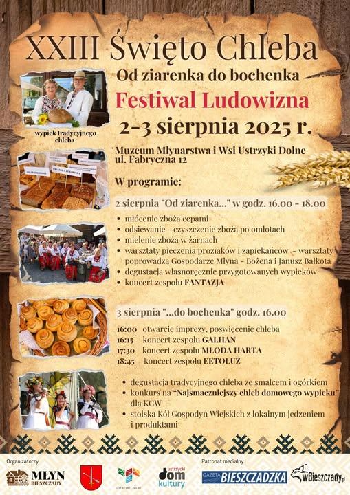 Weekend będziecie mogli spędzić także w Ustrzykach Dolnych, gdzie odbędzie się XXIII Święto Chleba „Od ziarenka do bochenka” połączone z Festiwalem Ludowizna. 2 sierpnia w Muzeum Młynarstwa i Wsi (przy ul. Fabrycznej 12) w programie będzie: młócenie zbożami cepami, odsiewanie, mielenie zboża w ziarnach, warsztaty pieczenia proziaków i zapiekańcóe, a także degustacja wypieków. Wieczorem odbędzie się koncert zespołu Fantazja. Na niedzielę zaplanowano degustację tradycyjnego chleba ze smalcem i ogórkiem, konkurs na najsmaczniejszy chleb domowego wypieku, a także smakołyki ze stoisk Kół Gospodyń Wiejskich. Drugiego dnia imprezy na scenie pojawią się zespoły: Gahan, Młoda Harta i Eetoluz.