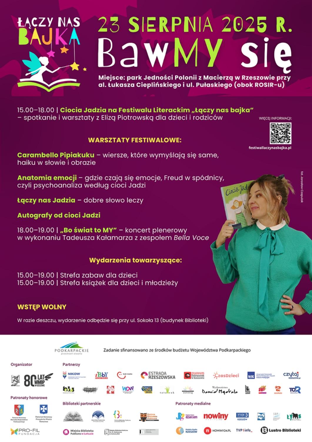 Tego samego dnia w godzinach 15:00 – 19:00 będziecie mogli wybrać obecność w Parku Jedności Polonii z Macierzą. Odbędzie się tam kolejne wydarzenie festiwalu literackiego „Łączy nas bajka” adresowanego do dzieci. Na miejscu będzie na całe rodziny będą czekać warsztaty z Elizą Piotrowską, wspólne czytanie wierszy, a także rozmowy o emocjach. Na scenie pojawi się Tadeusz Kałamarz z zespołem Bella Voce. Nie zabraknie także strefy zabaw, a w niej malowania twarzy i zwierzątek z balonów, oraz strefy książek dla dzieci i młodzieży. W razie niekorzystnych warunków pogodowych, wydarzenie odbędzie się w Wojewódzkiej i Miejskiej Bibliotece Publicznej przy ul. Sokoła 13.