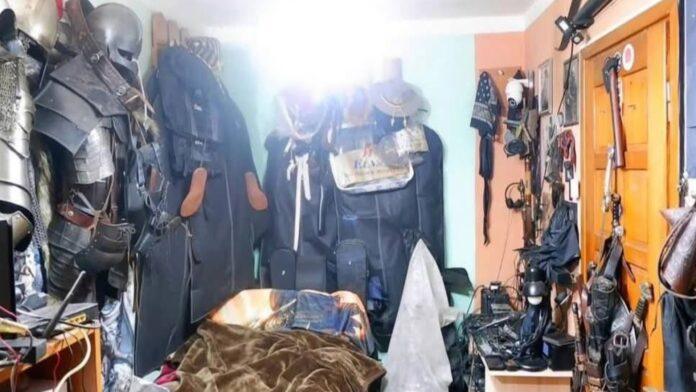 Na zdjęciach widać pomieszczenie wypełnione po sufit elementami uzbrojenia: metalowe zbroje, repliki mieczy, hełmy, kabury, pasy, ochraniacze, futerały, a nawet sprzęt przypominający wyposażenie LARP-owe. Na ścianach wiszą szable i pasy nośne, pod drzwiami stoją torby z wyposażeniem, a całe biurko zasłaniają przewody i akcesoria.