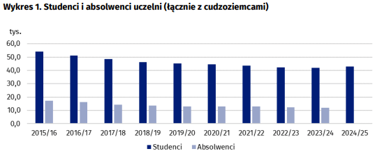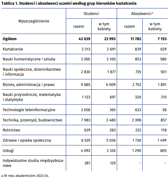 Mimo lekkiego wzrostu liczby studentów, uczelnie opuściło w 2024 roku 11,8 tys. absolwentów – o 3,8 proc. mniej niż rok wcześniej. Dominowali ci, którzy ukończyli studia pierwszego stopnia (56,5 proc.), a tylko 7 proc. stanowili absolwenci jednolitych studiów magisterskich.
