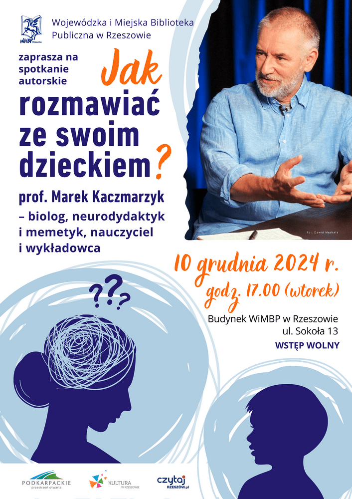 Prof. Marek Kaczmarzyk, specjalista od procesów uczenia się, nauczania i wychowania opowie w Rzeszowie o wyzwaniach współczesnego rodzicielstwa. Spotkanie we wtorek, 10 grudnia, o 17:00 w Budynku Głównym WiMBP w Rzeszowie, przy ul. Sokoła 13.