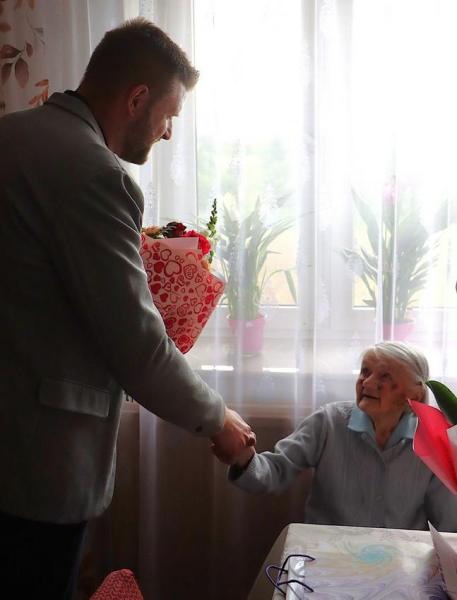 Ten, wraz z radnymi Kazimierzem Słoniną i Benedyktem Skibą oraz sołtysem Przemysławem Tajchmanem złożyli stulatce życzenia i przekazali jej kilka symbolicznych prezentów. Wśród nich znalazła się drewniana tabliczka z gratulacjami:
