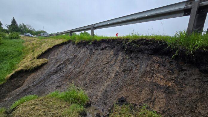 Uwaga kierowcy❗️W wyniku intensywnych opadów deszczu️osunęła się skarpa nasypu drogowego #DK84 w m. Zagórz. W związku z tym wprowadziliśmy częściowe wygrodzenie jezdni i ruch wahadłowy. Jedźcie ostrożnie! #Podkarpacie pic.twitter.com/bMC53XIf2D