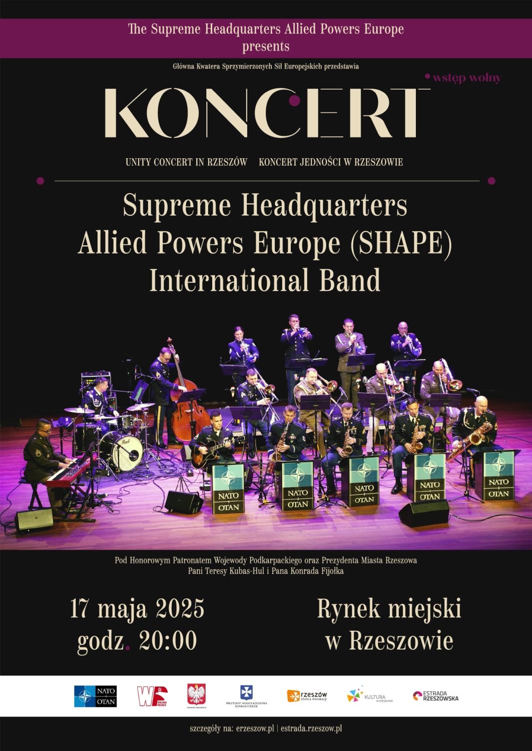 W sobotę (17 maja) o godz. 20:00 na Rynku w Rzeszowie odbędzie się „Koncert Jedności”. Publiczność będzie mogła wówczas podziwiać zespół jazzowy Międzynarodowej Orkiestry Sił Zbrojnych NATO w Europie (SHAPE).