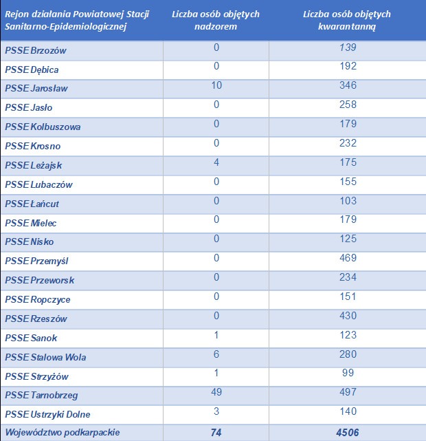 Obecnie pod nadzorem są 74 osoby, 4506 przechodzi kwarantannę, 76 przebywa w izolacji domowej. Z potwierdzonym COVID-19 hospitalizowanych jest 77 osób.
