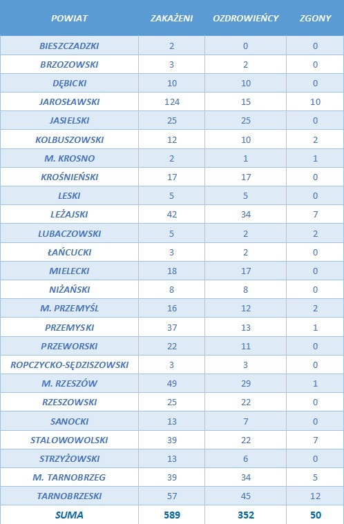 Liczba osób zarażonych koronawirusem na Podkarpaciu wzrosła do 582, z czego wyzdrowiało już 352 ooby, sanepid odnotował 50 zgonów. W naszym regionie dotychczas przeprowadzono 35 837 testów.
