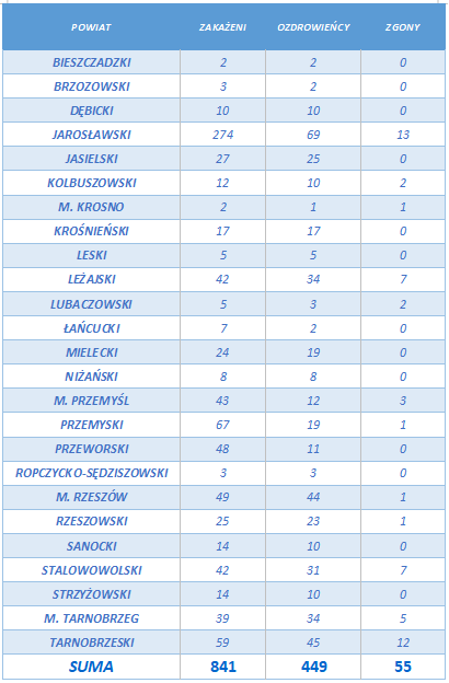 Na Podkarpaciu odnotowano 16 nowych zakażeń, najwięcej (10) w powiecie jarosławskim. Wśród nich jest 6 kobiet i 4 mężczyzn. Zakażenie potwierdzono także u mężczyzny z powiatu przemyskiego, kobiety z Przemyśla, dwóch osób z powiatu mieleckiego (kobiety i mężczyzny) oraz dwóch osób z powiatu łańcuckiego (kobiety i dziecka).
