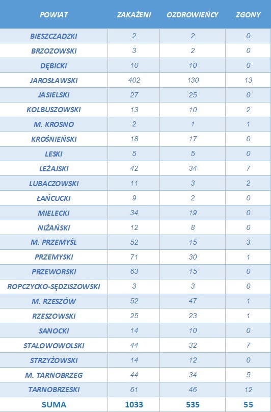 Ostatnich wyleczonych jest aż 20. To 13 osób z powiatu jarosławskiego, 3 osoby z powiatu przemyskiego, 2 osoby z Przemyśla, a także po jednej osobie z powiatu stalowowolskiego oraz tarnobrzeskiego.