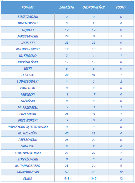 Na Podkarpaciu koronawirusem zaraziło się już 516 osób, zmarło 42, wyzdrowiało 345. Dotychczas przeprowadzono 31 698 testów. Pod nadzorem sanepidu pozostaje 30 osób, kwarantannę przechodzi 2759 osób, a w izolacji domowej przebywa 66. Aktualnie z potwierdzonym COVID-19 w podkarpackich szpitalach jest 63 osoby.